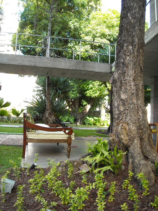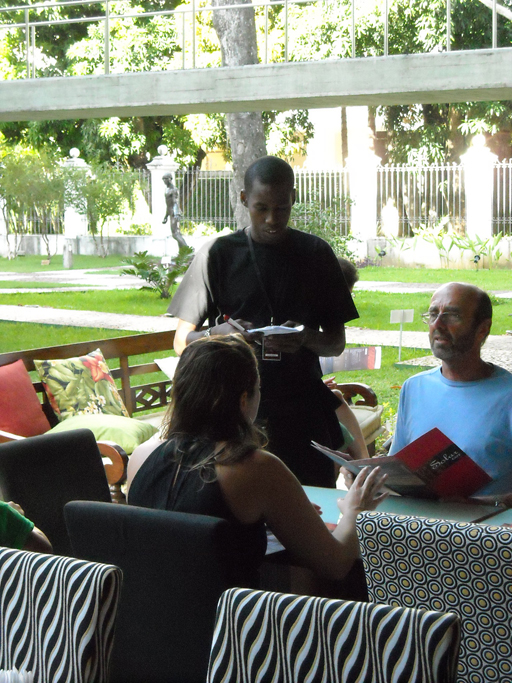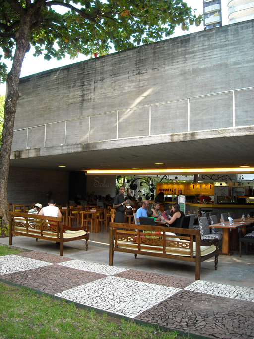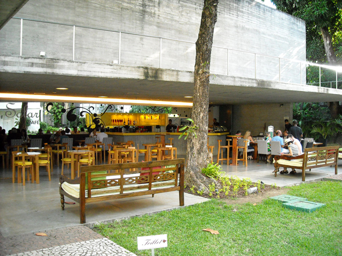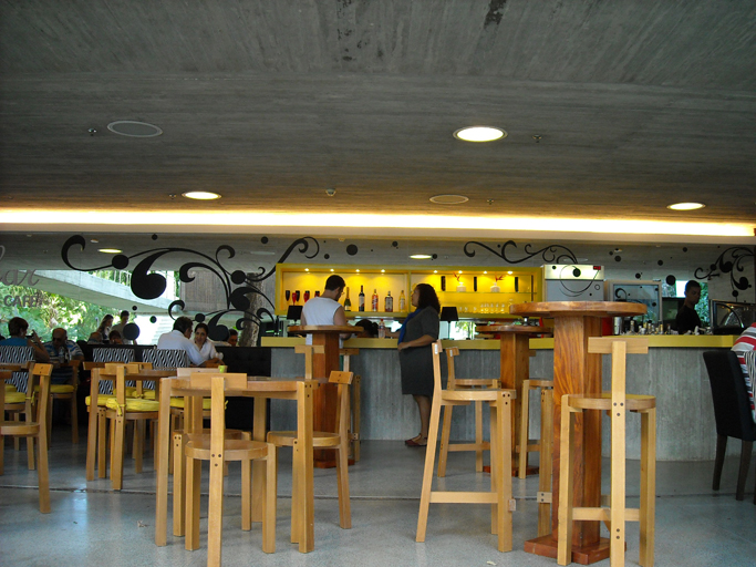 O café do pier é uma delicia, como já falamos aqui. E aumentou enormemente a circulação e permanência no museu. Atualmente, está fechado para reformar o pier, que é usado espontaneamente como trampolim pelos moleques da Gamboa de Baixo, o que vai permitir que se volte a chegar ao MAM de barco. Neste interim, o café do Museu Rodin Bahia Palacete das Artes foi licitado e aberto. O mesmo grupo do MAM ganhou a licitação, com cardápio similar, mudando a ambiência. Se o charme do pier do MAM são as lâmpadas em gambiarra e os pufs de xitão, no Rodin é classudo, com enormes recamiêrs para se tirar cochilos, cadeiras girafa de Lina Bo Bardi em duas alturas, espelhão de fora a fora, jardins, etc.