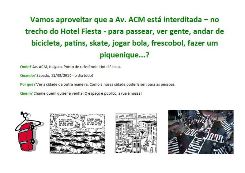 Primeira é que o pessoal da Faculdade de Arquitetura da UFBA se propôs a fazer uma ocupação urbana na Avenida ACM, no Itaigara, que vem sendo sempre interditada para obras de macrodrenagem (e consequente retirada de árvores decanas que garantiam a microdrenagem e o sombreamento da área, mas isso é assunto pra outro Salvador, capital Oslo), conforme avisa flyer abaixo.