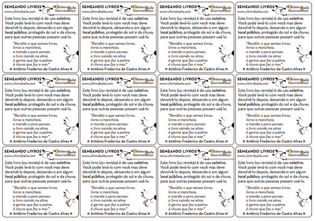 Quem quiser usá-lo em seu próprio book-crossing basta pedir o arquivo em formato A4, PDF, com 12 selos como esse, através de comentários neste post, e eu envio por email. Daí leva o arquivo numa gráfica e imprime – colorido ou preto&branco, como queiram. Atenção: tem de pedir que se impra em papel adesivo, e de preferência que se refile lá mesmo, já que é muito estreito o intervalo entre os selos para ser cortado em casa com tesoura por não-profissionais. Uma vez pronto, cola-se na capa do livro ou revista, que passa assim a ser “timbrada” como um bem coletivo, com suas regras de uso bem explícitas. A folha com doze selos fica mais ou menos como essa abaixo: