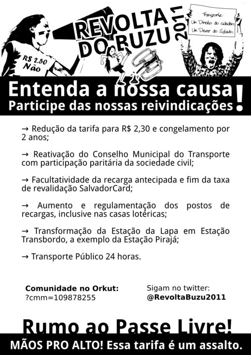 Por força da circunstância de que esta semana se tentou reorganizar algo similar ao que foi a já mítica Revolta do Buzú (Salvador, Bahia, setembro de 2003), venho tratar do assunto. Por um lado, porque esta tentativa de reacender a chama viva das batalhas campais contra a ditadura carlista (era disso que se tratava, na prática) é louvável; por outro, porque o modus operandi do atual movimento me parece pseudo-sofisticado, e por isso menos potente e menos eficiente. Sinal dos tempos.