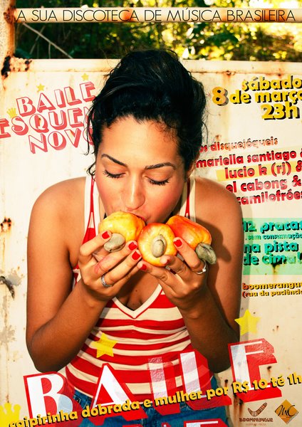 Em geral, as fotos são colhidas de cenas reais da rua, que mostram essa xibungagem resistente e resiliente da Capital Diaspórica, como esta foto do negão em meio a uma barraca de frutas típica do bairro do Canela – acrescido, claro, do ar retrô do fone de ouvido imenso. E ar retrô costuma comparecer em tudo no Esquema, ainda que não seja uma festa “de música retrô”, ou não apenas de música retrô. Entretanto, me agrada especialmente essa sensualidade sexy e algo bissexuada que quase sempre comparece nestas obras-primas de cartazes do Esquema. Como neste abaixo, da edição especial do Dia Internacional da Mulher: